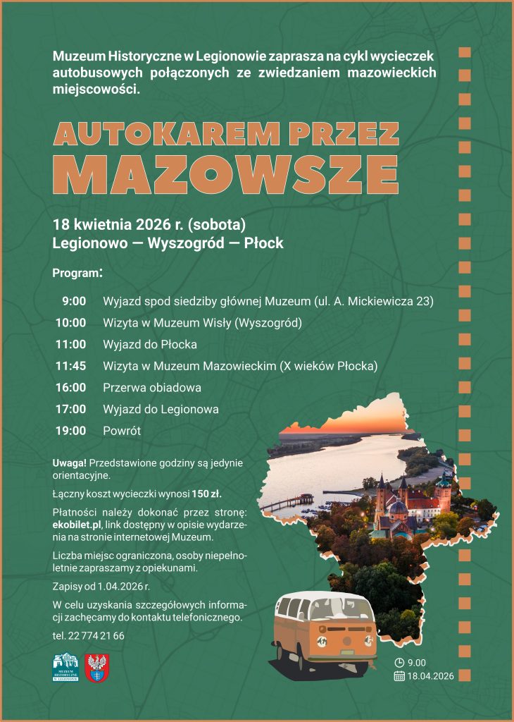 Najbliższa wycieczka odbędzie się 18 kwietnia 2026 r. (sobota) i będzie obejmowała trasę: Legionowo 🚌 Wyszogród 🚌 Płock.