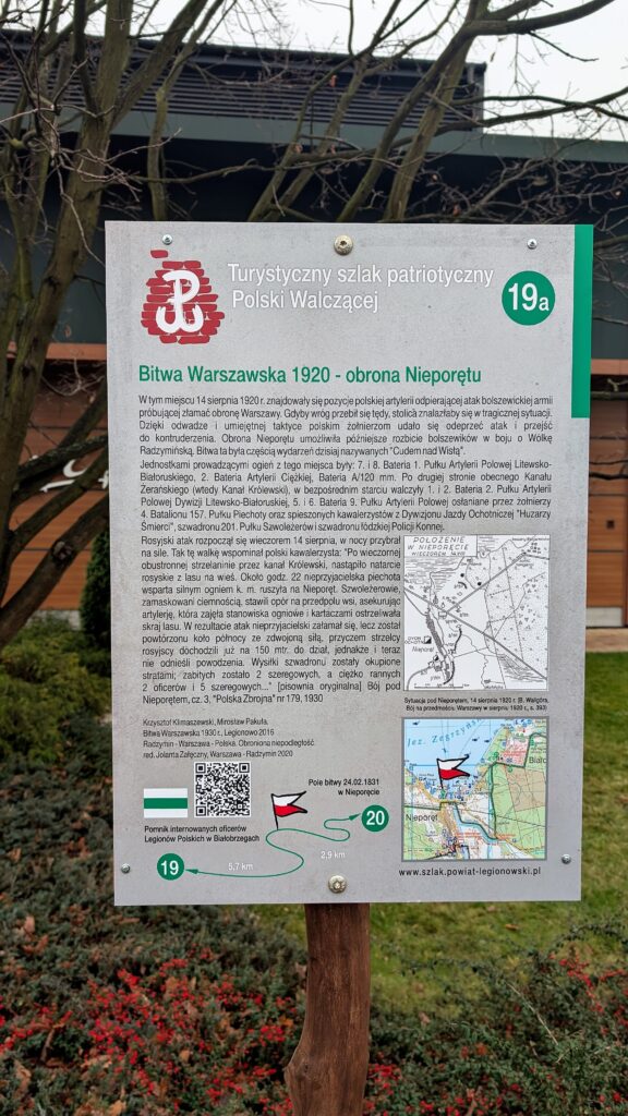 Nieporęt – ujście Kanału Żerańskiego do Jeziora Zegrzyńskiego – miejsce również związane z 1920 rokiem. Tutaj, podczas batalii z bolszewikami, sytuacja była jeszcze bardziej krytyczna. Napór wroga groził przełamaniem polskich pozycji, co umożliwiłoby bezpośrednie uderzenie na Warszawę i wdarcie się hordy do stolicy. Nieustępliwość naszego żołnierza podczas nocnego boju zatrzymała rosyjską dzicz, co przyczyniło się do odbicia Radzymina i zmaterializowania się tzw. „cudu nad Wisłą”