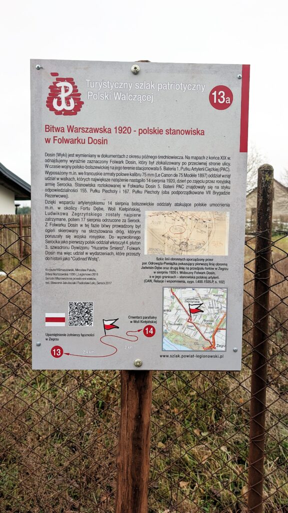 Folwark Dosin – miejsce stacjonowania polskiej artylerii w 1920 r., której ogień odegrał kluczową rolę w powstrzymaniu natarcia bolszewickiego na Twierdzę Zegrze. Armaty swoim ogniem znacznie przyczyniły się do odparcia ataków Rosjan, którzy po opanowaniu Serocka dążyli do przejęcia Twierdzy Zegrze. Po 2 dniach walki nasze wojska przeszły do kontrofensywy. Udało się nie tylko pokrzyżować plany bolszewików, ale również wyrzucić ich z Serocka i pognać dalej na północ, a potem na wschód.